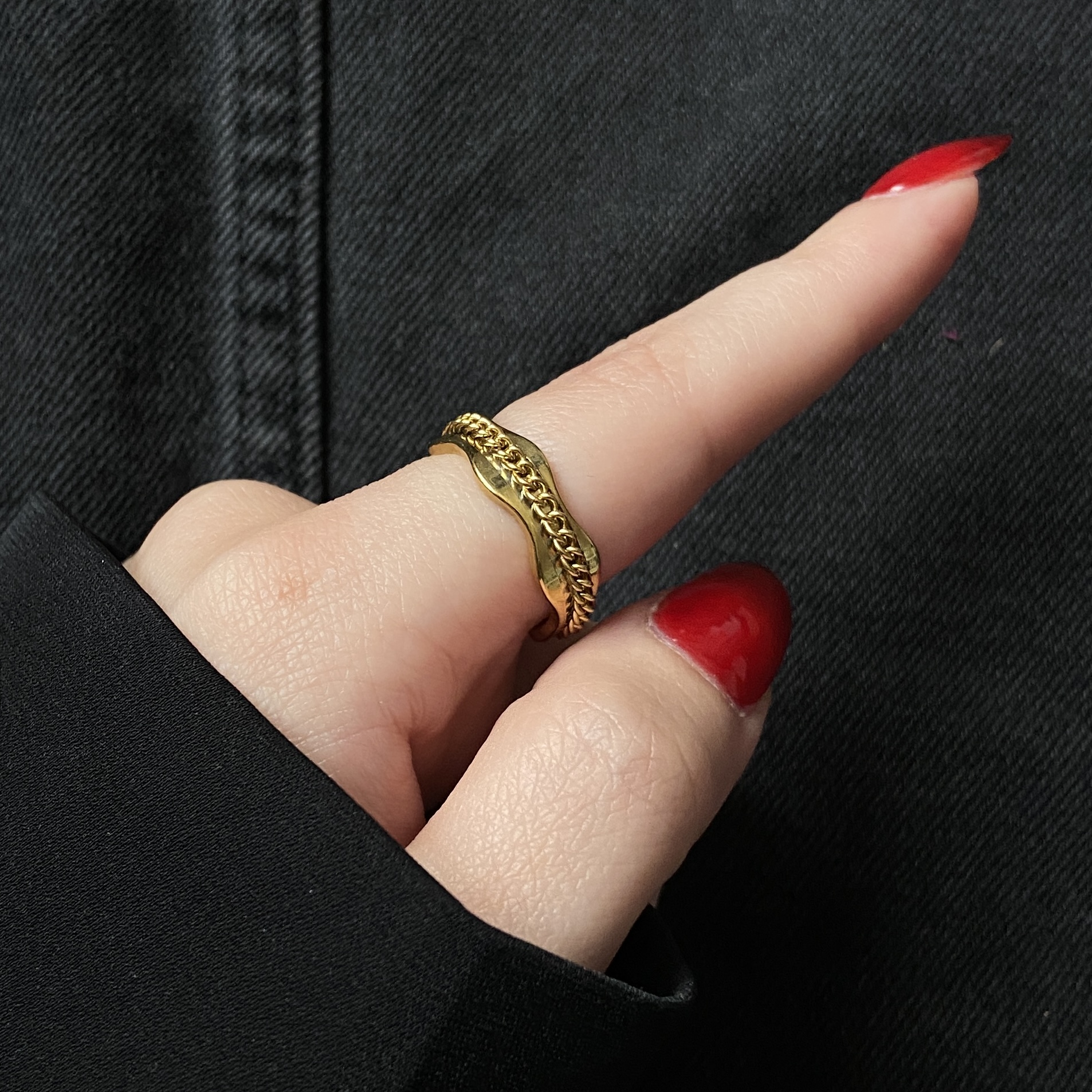 این انگشتر خاص، ترکیبی از طراحی مدرن و کارایی فوقالعاده است. ظاهر دفرمه و زنجیری آن، زیبایی و منحصربهفردی را به استایل شما اضافه میکند.