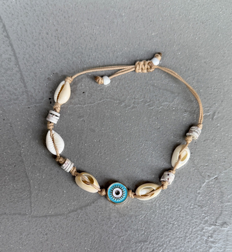 مهره چشمنظر، بهعنوان نمادی از دور نگه داشتن انرژیهای منفی، در کنار صدف طبیعی قرار گرفته تا این دستبند را به انتخابی خاص برای استفادهی روزمره یا هدیهدادن تبدیل کند. بند چرمی نرم و قفل کشویی، استفاده از آن را راحت و قابل تنظیم برای همهی مچها میکند.