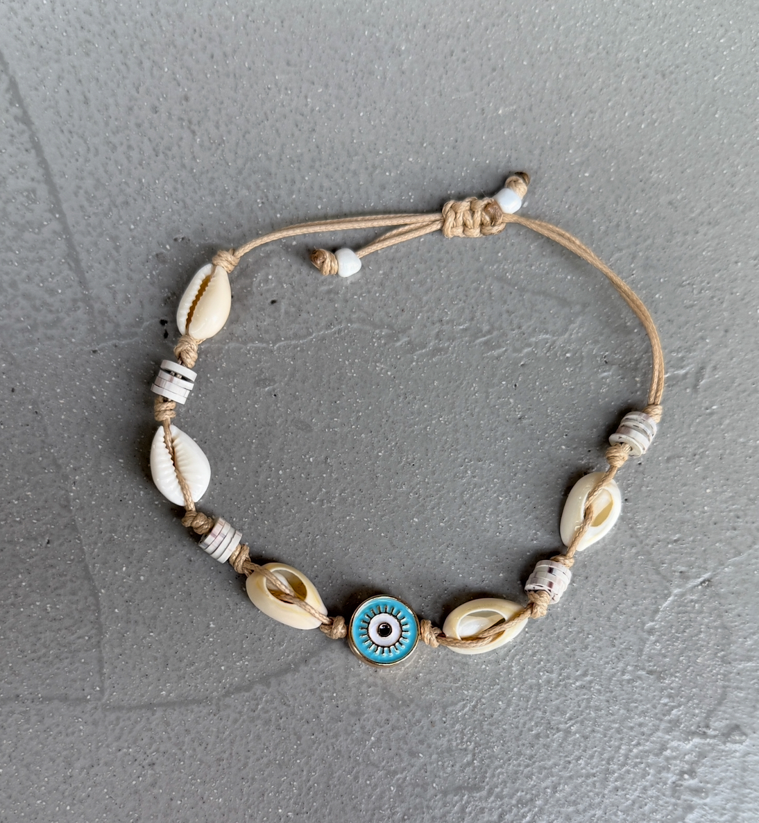 دستبند چشمنظر و صدف کد ۸، ترکیبی از زیبایی طبیعی صدف و انرژی محافظتی چشمنظر است.
