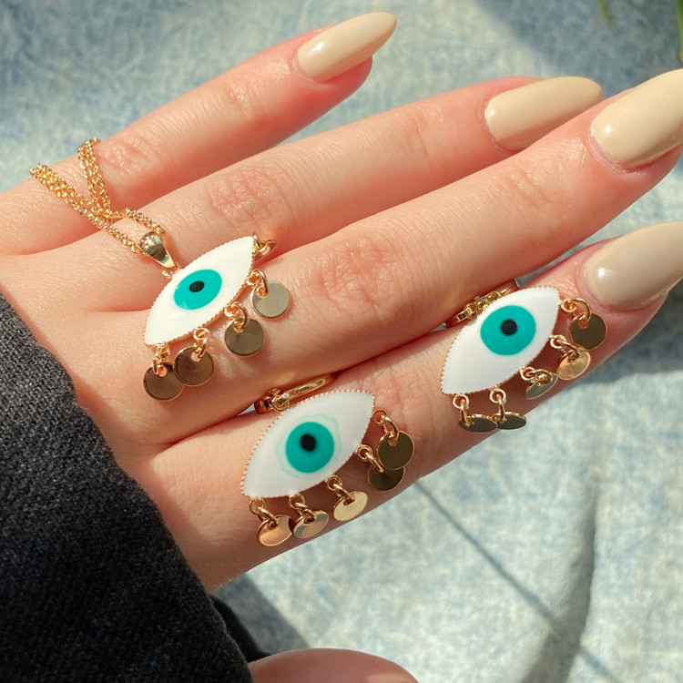 ست گوشواره و گردنبند چشمنظر ژوپینگ کد ۵، طراحی شده برای کسانی که به دنبال ترکیب زیبایی و حس محافظت هستند.