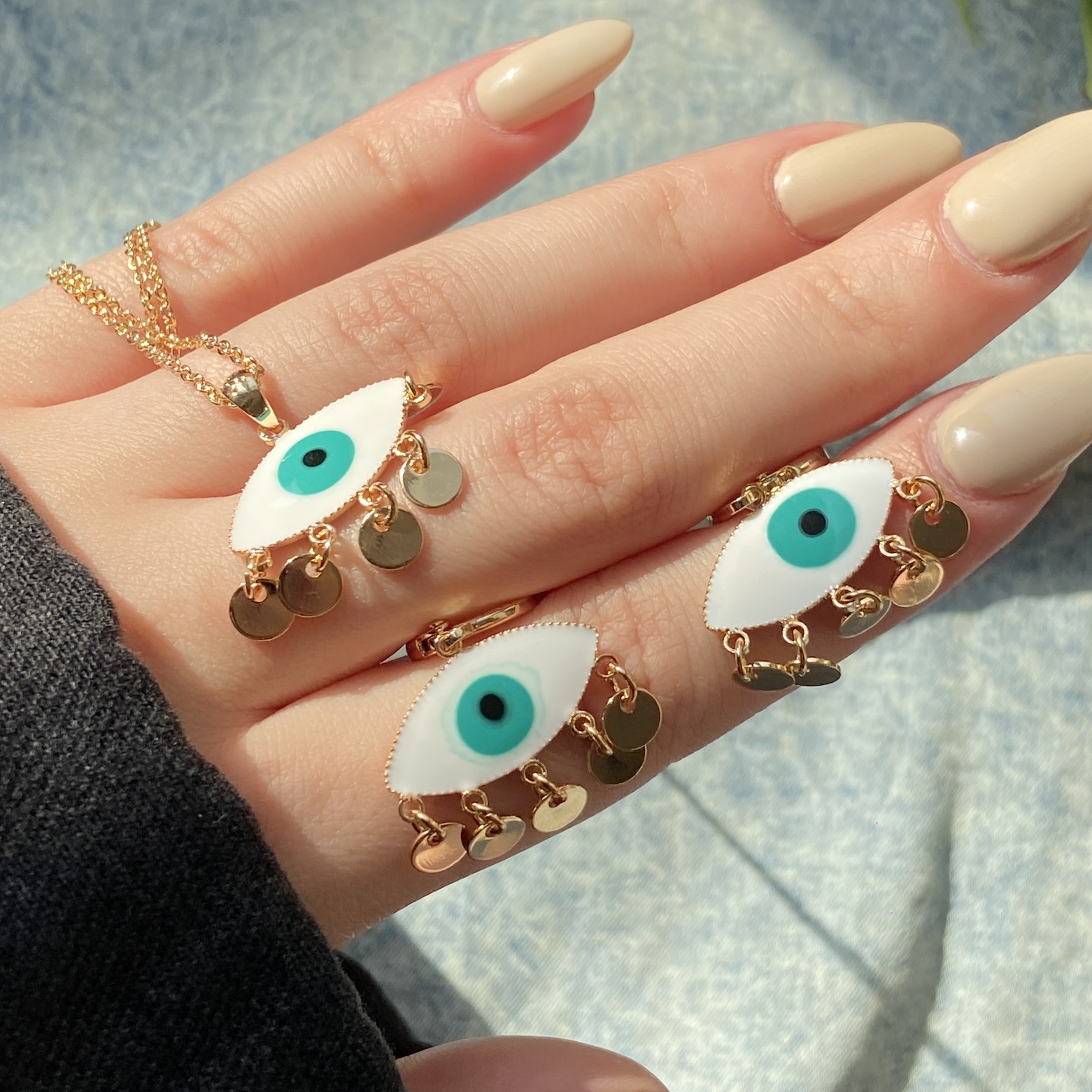 ست گوشواره و گردنبند چشمنظر ژوپینگ کد ۵، طراحی شده برای کسانی که به دنبال ترکیب زیبایی و حس محافظت هستند.