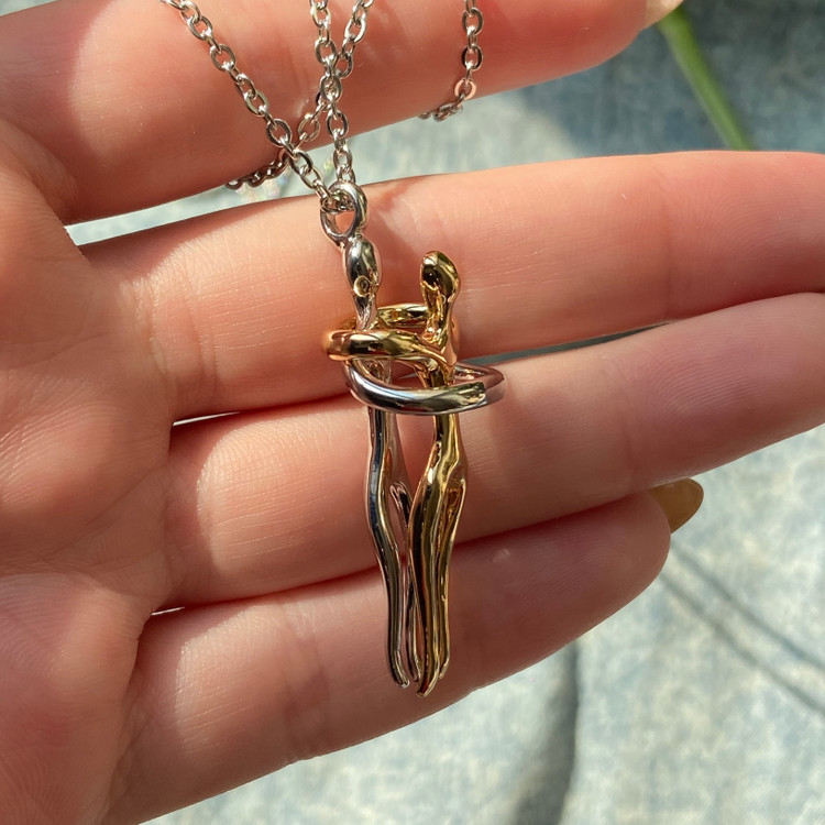 این گردنبند از دو تکه مجزا تشکیل شده که هنگام قرار گرفتن کنار هم، حالتی شبیه آغوش ایجاد میکنند — انگار دو نفر یکدیگر را در آغوش گرفتهاند.