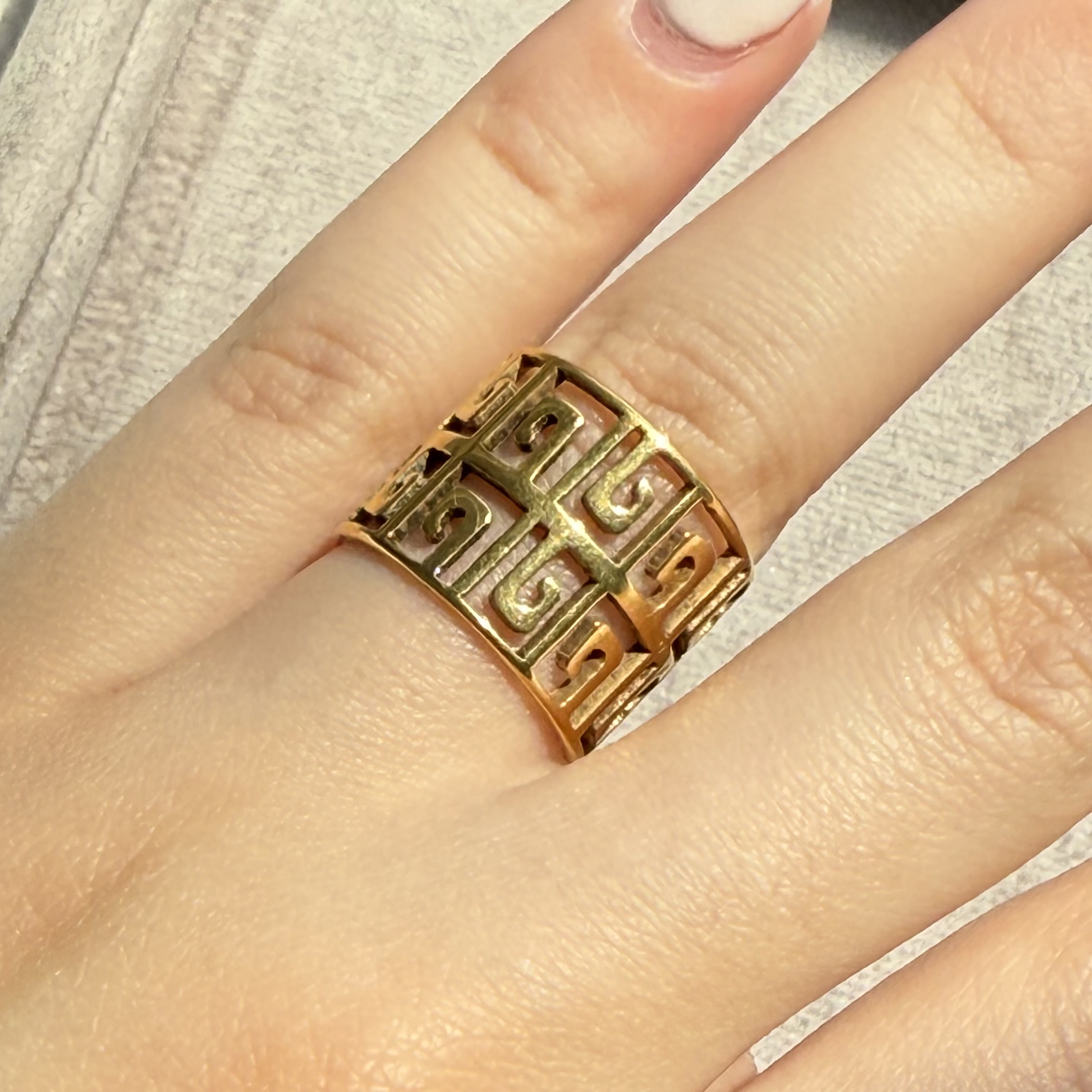 این انگشتر طلایی با طراحی الهامگرفته از سبک ورساچه، ترکیبی از لوکس بودن و مدرن بودن را به استایل شما اضافه میکند.