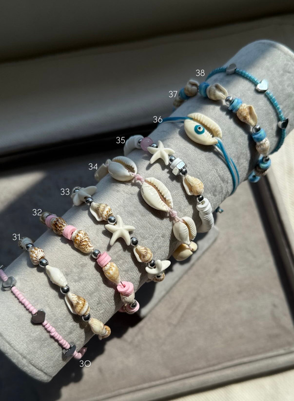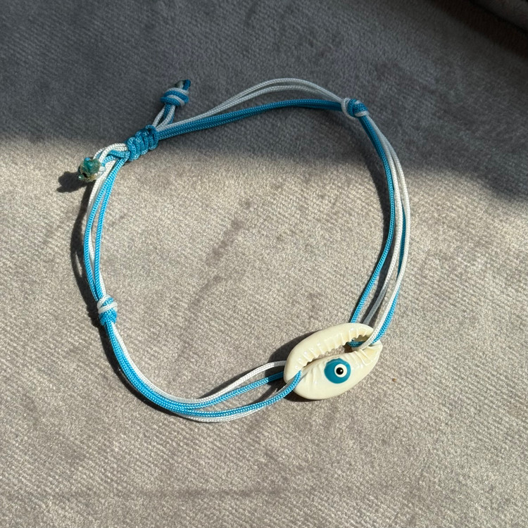 دستبندی با ترکیب صدفهای رنگی آبی که حس تازگی، دریا و آرامش رو منتقل میکنه.