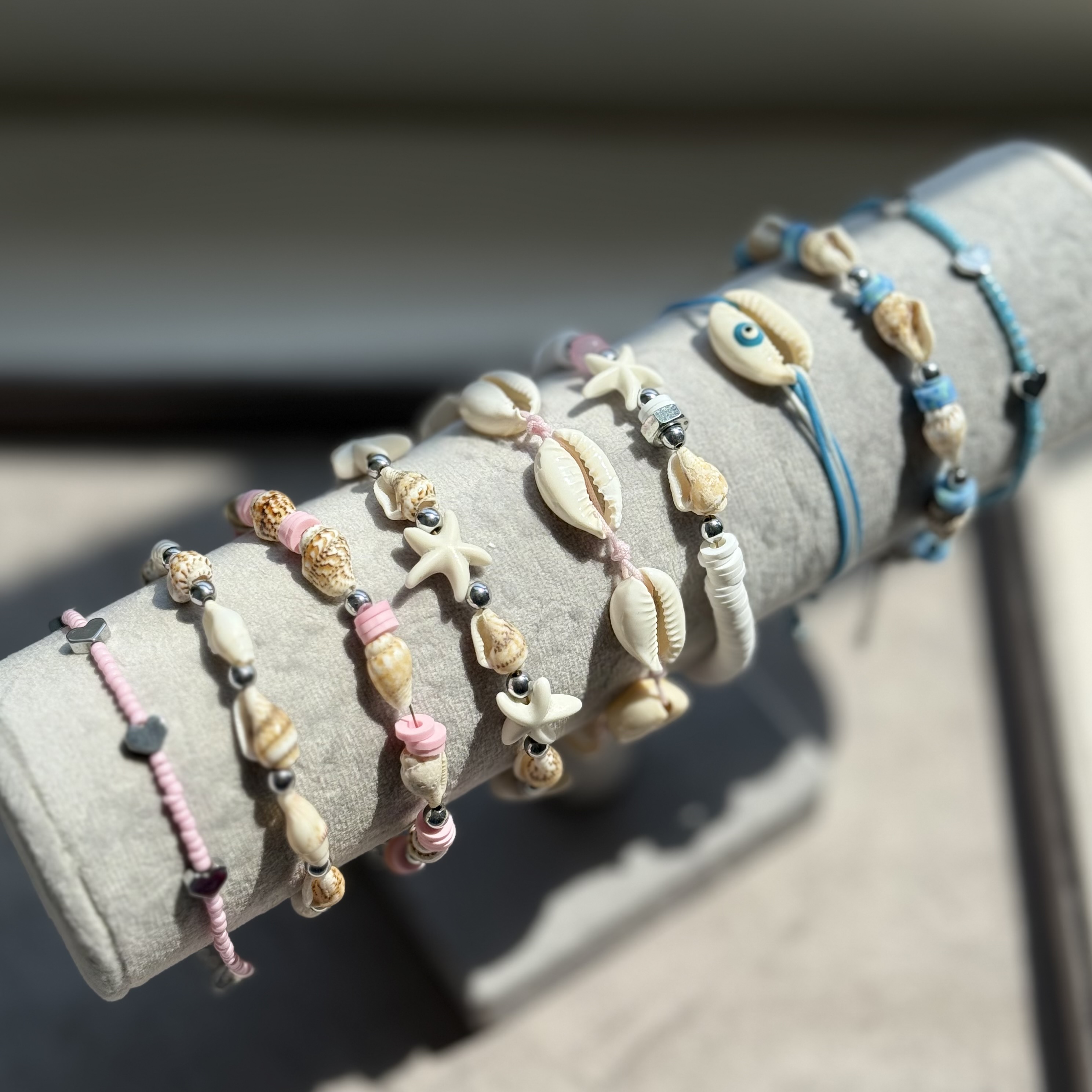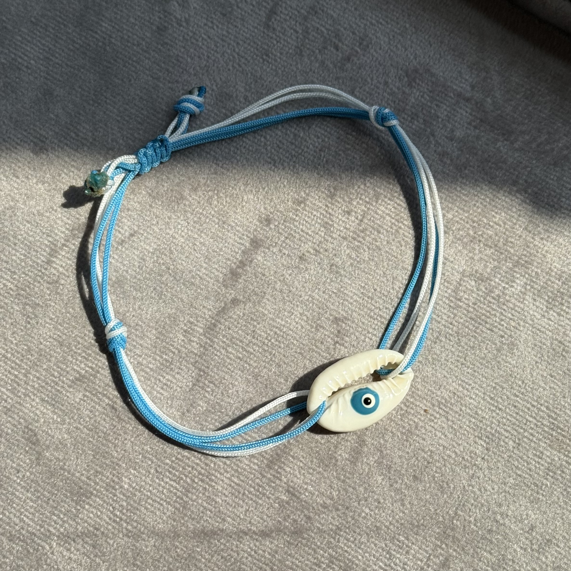 دستبندی با ترکیب صدفهای رنگی آبی که حس تازگی، دریا و آرامش رو منتقل میکنه.