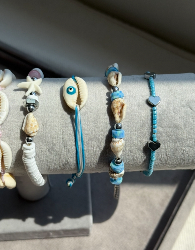 این دستبند با ترکیب گوشماهی طبیعی و مهرههای فیمو آبی، حس سرزندگی، دریا و طراوت تابستونی رو به استایلت اضافه میکنه.